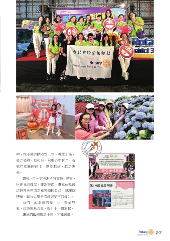 D3522 珍愛 天 神 奇 扶 輪 365 袍,在不同的階段穿上它,勇敢上場, 發光發熱。我相信,只要心中有光,就 能在扶輪的路上,越走越遠、越走越 亮。 最後,再一次感謝所有支持、包容、 陪伴我的社友。謝謝妳們,讓我在社長 這個角色中成為更完整的自己;也謝謝 扶輪,給我這麼多成長與學習的養分。 我們一起走過的每一步,都是歷 史,也將成為力量,指引下一段旅程。 讓我們繼續敢於不同,才能破圈。 26 6 We are Rotary 27