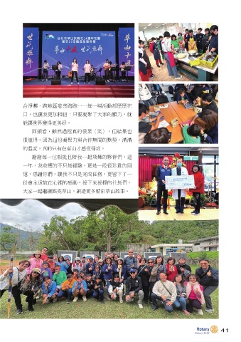 合淨灘、跨地區慈善路跑……每一場活動都歷歷在 目,也讓我更加相信:只要凝聚了大家的願力,就 能讓世界變得更美好。 回頭看,雖然過程真的很累(笑),但結果也 很值得。因為這份凝聚力與合作無間的默契,滿滿 的溫度,真的只有在草山才感受得到。 謝謝每一位相挺且陪我一起飛舞的夥伴們,這 一年,我收穫的不只是經驗,更是一段很珍貴的回 憶,感謝你們,讓我不只是完成任務,更留下了一 份會永遠放在心裡的感動。接下來接棒的社長們, 大家一起繼續點亮草山,創造更多精彩草山故事。 41