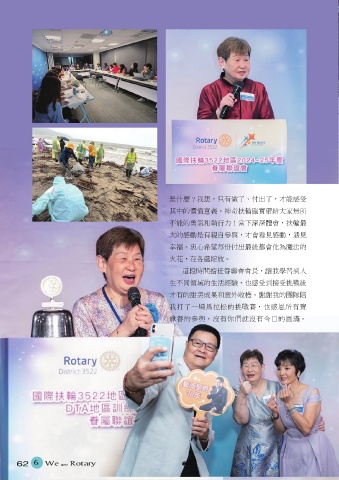 是什麼?我想,只有做了、付出了,才能感受 其中的價值意義。神奇扶輪確實帶給大家無所 不能的勇氣和執行力!當下深深體會,扶輪最 大的感動是有親自參與,才會看見感動,遇見 幸福。衷心希望每份付出最後都會化為魔法的 火花,在各處綻放。 這段時間擔任眷聯會會長,讓我學習到人 生不同領域的生活經驗,也感受到接受挑戰後 才有的甜美成果和意外收穫。謝謝我的團隊陪 我打了一場馬拉松的挑戰賽,也感恩所有寶 尊眷的參與,沒有你們就沒有今日的圓滿。 62 6 We are Rotary 63